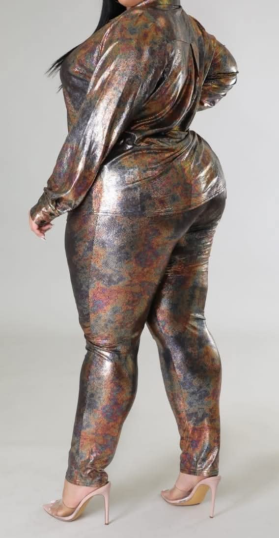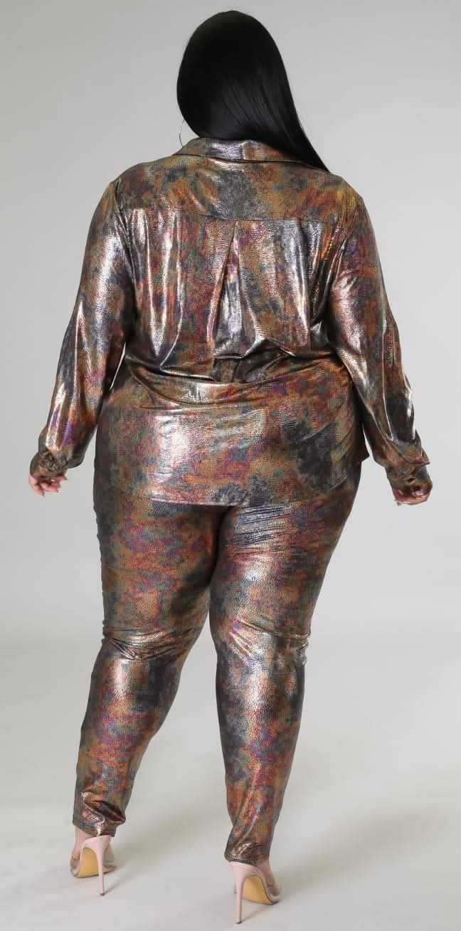 Step into your spotlight with the Radiant Reign Pant Set—a shimmering, multicolored ensemble designed for queens who command attention with grace and glow. This iridescent two-piece features a button-up top and matching pants that reflect hues of gold, bronze, sapphire, and firelight red, shifting with every move. The fit is bold yet forgiving, tailored to celebrate curves and confidence.